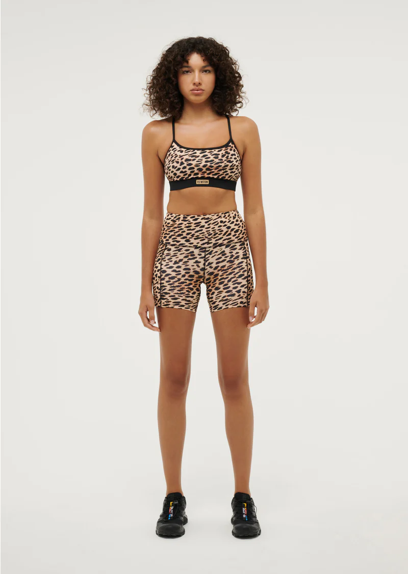 The Power Move Sports Bra in Cheetah Print comes as part of our Departure Lounge Collection – timeless staples in signature fabrications you’ll never want to take off. This scoop neckline sports bra features a racerback with adjustable straps and encased elastic at the underbust for optimal support and comfort during your workouts. Complete with a P.E Nation logo patch, it’s crafted using our versatile EVERYWEAR fabric, perfect for yoga, Pilates, and transitioning seamlessly into leisure and lifestyle activities. Style it with the Recalibrate 5” Bike Short in Cheetah Print, West Fourth Trackpant in Dark Shadow and Head Coach Pant in Dark Navy. Please note, due to the use of different matte finish fabrics on the Power Move Sports Bra and Recalibrate Print 5″ Bike Short, the print finish – though subtle – may vary slightly between the two.