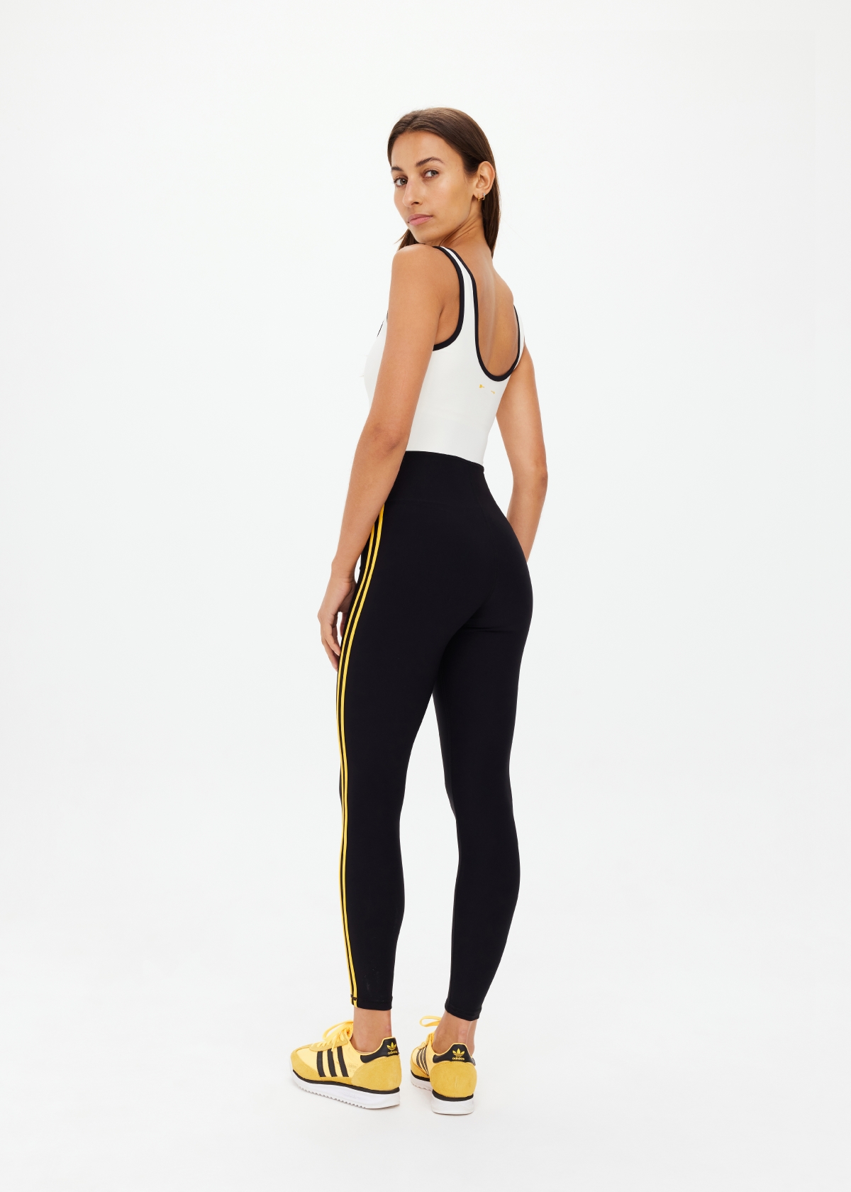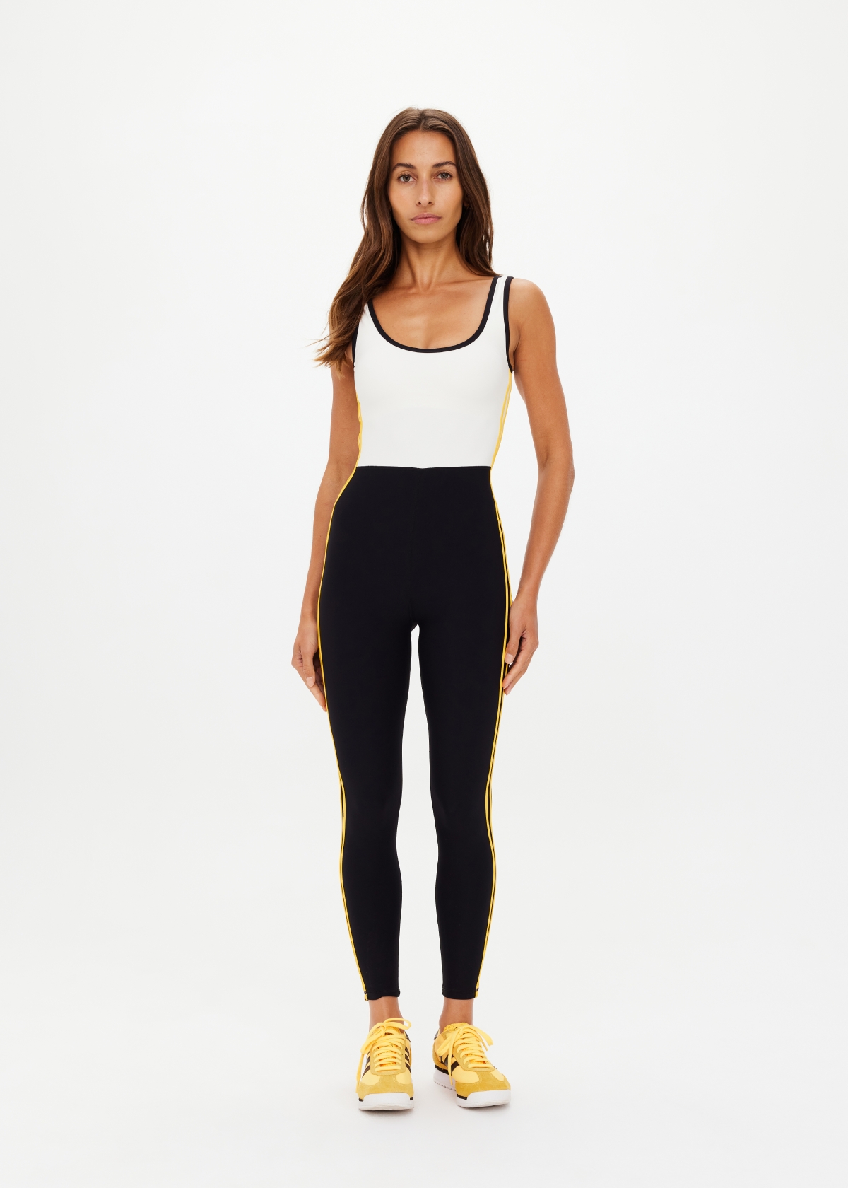 - Scoop neck catsuit spliced in black and cream
